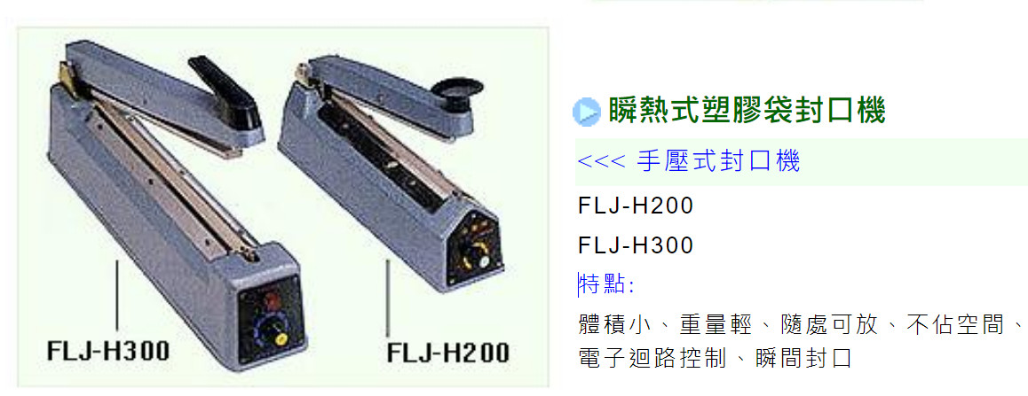電子迴路控制、瞬間封口 ●手壓式封口機可用於PP、PE、OPP、PVC塑膠袋、保麗袋等熱封性質袋子